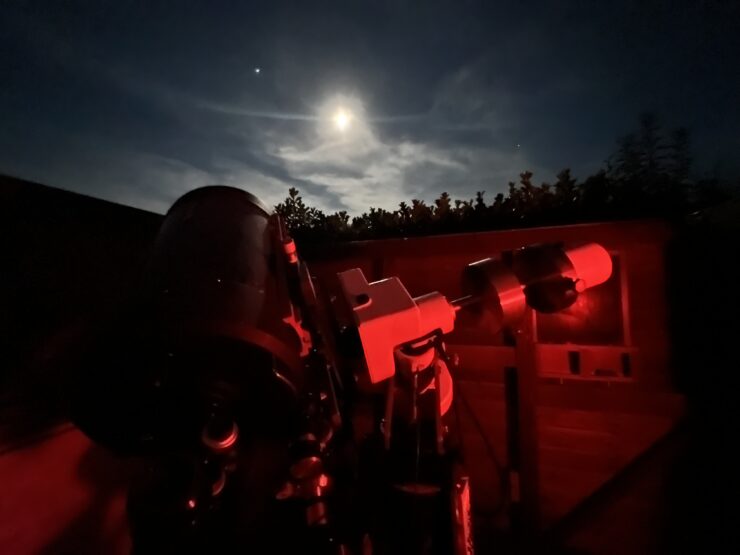 A late “summer” day in October tempted me to observe Jupiter and the moon. Warmy windy weather resulted in bad seeing. That was quite predictable. Very interesting constellation of 3 jovian moons.